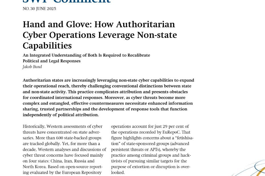 Hand and Glove: How Authoritarian Cyber Operations Leverage Non-state Capabilities 26 June 2025 Bund, Jakob EN Authoritarian states are increasingly leveraging non-state cyber capabilities toRead More »Hand and Glove: How Authoritarian Cyber Operations Leverage Non-state Capabilities