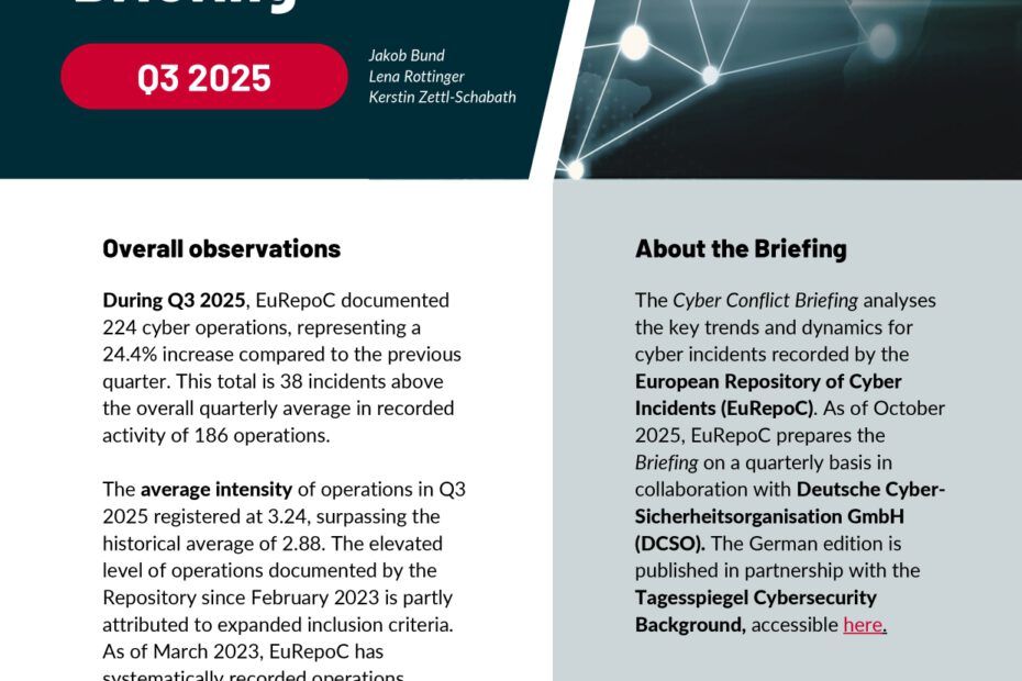 EuRepoC Cyber Conflict Briefing – Q3 2025 Key trends, dynamics, and findings on cyber incidents 13 November 2025 Bund, Jakob; Rottinger, Lena; Zettl-Schabath, Kerstin ENRead More »EuRepoC Cyber Conflict Briefing – Q3 2025