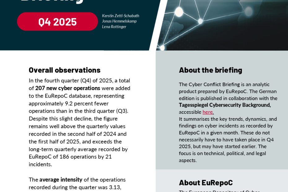 Cyber Activity Balance 2025: The European Union in Focus Fostering Situational Awareness through the European Repository of Cyber Incidents (EuRepoC) 12.02.2026 Rottinger, Lena; Bendiek, Annegret;Read More »Cyber Activity Balance 2025: The European Union in Focus